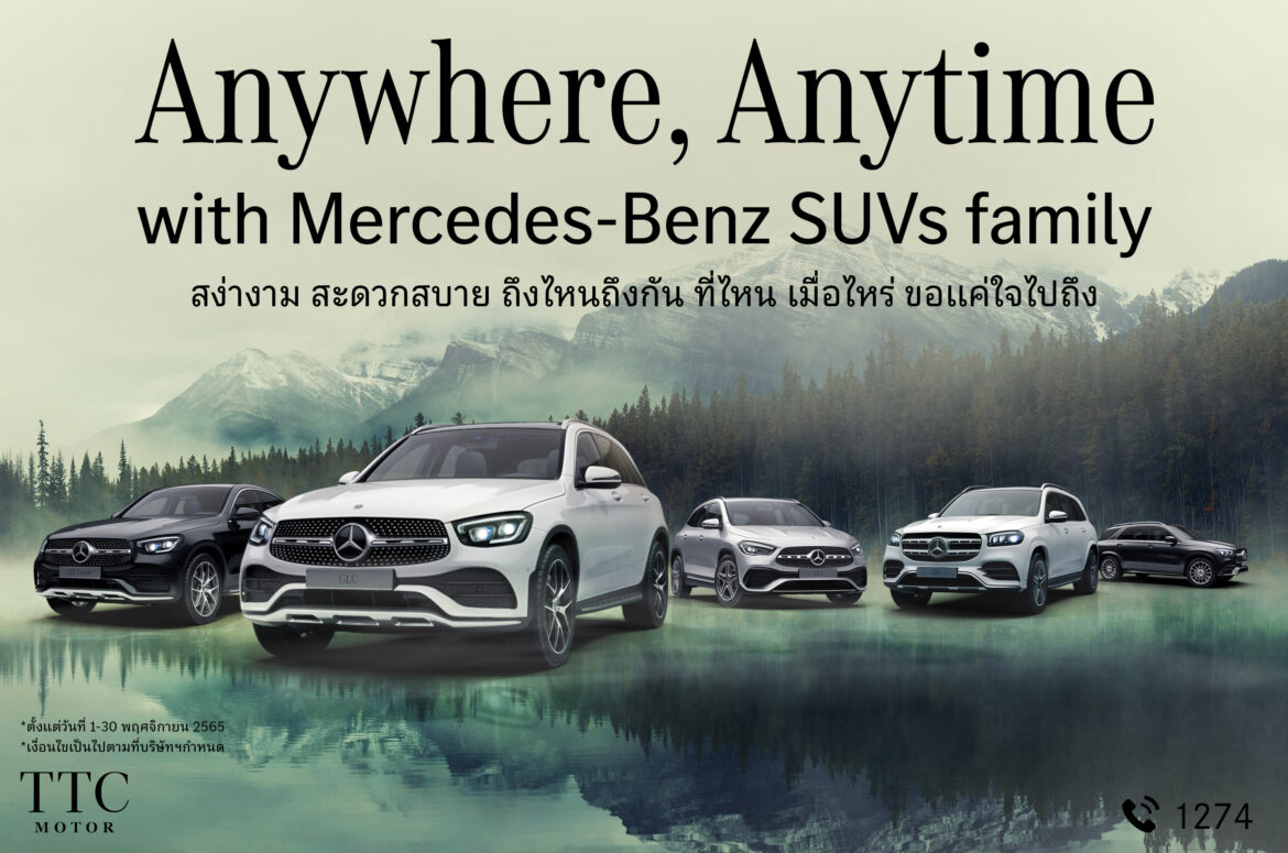 TTC Motor จัดแคมเปญส่งท้ายปลายปี ANYWHERE , ANYTIME with Mercedes-Benz SUVs family สง่างาม สะดวกสบาย ถึงไหนถึงกัน ที่ไหน เมื่อไหร่ ขอแค่ใจไปถึง ดาวน์เริ่มต้น 0% , ผ่อนเริ่มต้น 19,900 บาท, ประภัยชั้น 1 นาน 5ปี , โปรแกรมบำรุงรักษารถ นาน 5 ปี พร้อมออกรถตอนนี้ผ่อนอีกทีปีหน้า รับทันที iPhone 14 Pro Max เมื่อจองและรับรถในเดือนพ.ย.65 เดินหน้าเสริมประสิทธิภาพเจ้าหน้าที่บริการ เพื่อตอบโจทย์การบริการสูงสุดแก่ลูกค้า