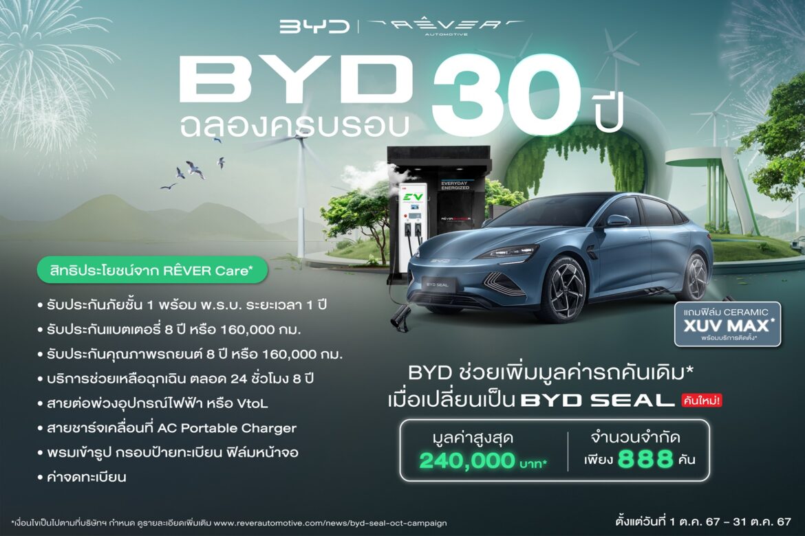 บีวายดี บริษัทเทคโนโลยีชั้นนำที่มุ่งมั่นสร้างนวัตกรรมเพื่อยกระดับคุณภาพชีวิต และ บริษัท เรเว่ ออโตโมทีฟ จำกัด ผู้จัดจําหน่ายและให้บริการหลังการขายรถยนต์พลังงานไฟฟ้าบีวายดีอย่างเป็นทางการในประเทศไทย ภายใต้กลุ่มธุรกิจเรเว่ ในโอกาสที่สาธารณรัฐประชาชนจีนครบรอบ 75 ปีแห่งการก่อตั้ง ขอส่งความยินดีเนื่องในโอกาสที่บริษัท BYD กำลังจะครบรอบ 30 ปี และพร้อมที่จะก้าวสู่ทศวรรษใหม่ด้วยความมุ่งมั่น เตรียมก้าวสู่ทศวรรษใหม่อย่างเต็มภูมิด้วยความมุ่งมั่นที่จะสานต่อความร่วมมือทางธุรกิจอย่างรอบด้านระหว่างสองบริษัท ควบคู่ไปกับการขับเคลื่อนอุตสาหกรรมยานยนต์ไฟฟ้าเพื่อเปลี่ยนผ่านประเทศไทยสู่ยุคพลังงานใหม่ โดยในโอกาสนี้ บีวายดี และ เรเว่ ออโตโมทีฟ ได้จัดแคมเปญสุดพิเศษแทนคำขอบคุณลูกค้าชาวไทย ช่วยเพิ่มมูลค่ารถคันเดิม เมื่อเปลี่ยนเป็น BYD SEAL คันใหม่ มูลค่าสูงสุด 240,000 บาท จำนวนจำกัดเพียง 888 คัน ตั้งแต่วันที่ 1 – 30 ตุลาคม 2567