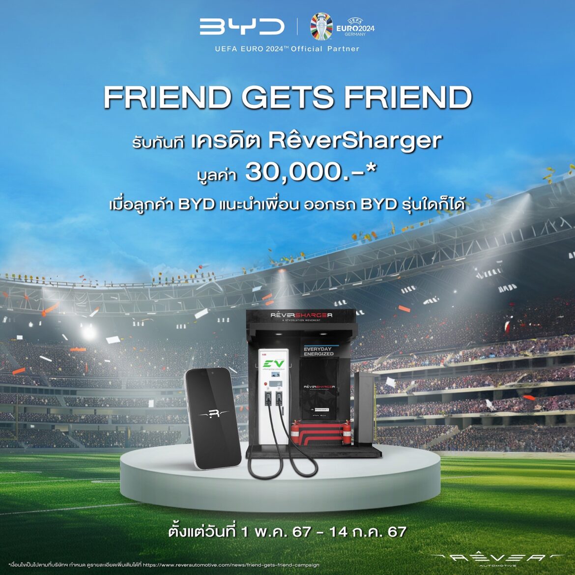 บริษัท เรเว่ ออโตโมทีฟ จำกัด ผู้จัดจําหน่ายและให้บริการหลังการขายรถยนต์พลังงานไฟฟ้า BYD อย่างเป็นทางการในประเทศไทย พร้อมเดินหน้าขับเคลื่อนการเปลี่ยนประเทศไทยสู่สังคมยานยนต์ไฟฟ้าและความเป็นกลางทางคาร์บอน และในโอกาสเทศกาลการแข่งขันฟุตบอลยูโร 2024 ที่มาถึงนี้ ทาง BYD ได้มีโอกาสเป็นผู้สนับสนุนหลักอย่างเป็นทางการ เรเว่ฯ จึงขอส่งมอบความพิเศษด้วยแคมเปญ BYD Euro Privilege สุดยิ่งใหญ่ต้อนรับยูโร 2024 รับถึง 3 ต่อ มอบสิทธิประโยชน์สุดคุ้มค่าให้แก่ผู้ใช้ BYD ทุกท่าน เพียงชวนเพื่อนหรือคนรู้จักซื้อรถยนต์ไฟฟ้า BYD ทุกรุ่น รับฟรี! 30,000 เครดิตสำหรับชาร์จรถไฟฟ้า ณ จุดชาร์จของ RÊVERSHARGER รวมถึงชุดของสมนาคุณสุดเอ็กซ์คลูซีฟ ลิขสิทธิ์แท้ UEFA EURO 2024 อีกมากมาย โดยเครดิตที่ได้ยังสามารถใช้ร่วมกับโปรโมชัน Plug and Charge ชาร์จไฟอย่างจุใจได้ในราคาเพียง 4 บาท/หน่วย ซึ่งขยายโปรโมชันไปจนถึง 14 กรกฎาคมนี้ได้อีกด้วย ผู้ที่สนใจสามารถเข้าร่วมแคมเปญได้ตั้งแต่วันที่ 1 พฤษภาคม – 14 กรกฎาคม 2567