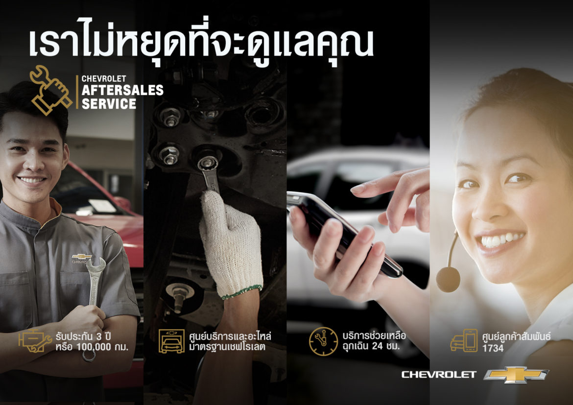 “เชฟโรเลตยินดีให้บริการลูกค้าด้วยความเอาใจใส่ เปี่ยมด้วยคุณภาพและเชื่อถือได้ ช่างผู้เชี่ยวชาญ, ที่ปรึกษาด้านบริการ, พนักงานฝ่ายลูกค้าสัมพันธ์ของเราพร้อมช่วยเหลือดูแลให้ทุกท่านถึงที่หมายอย่างสะดวกสบายที่สุด โดยเป็นการทำงานร่วมกันของทีมบริการหลังการขาย ดังต่อไปนี้”
