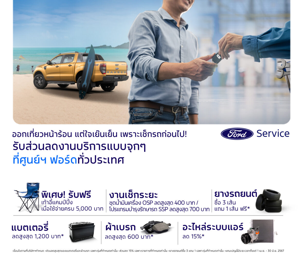ฟอร์ด ประเทศไทย จัดแคมเปญ ‘อากาศมันร้อน แต่รถฟอร์ดเย็นของแทร่’ ข้อเสนอด้านบริการสุดคุ้มให้ลูกค้าใช้รถได้อย่างอุ่นใจตลอดการเดินทางท่องเที่ยวในช่วงฤดูร้อน ประกอบด้วย ส่วนลดค่าอะไหล่ระบบปรับอากาศถึง 15% ส่วนลดพิเศษชุดน้ำมันเครื่องสูงสุด 400 บาท หรือส่วนลดโปรแกรมบำรุงรักษาตามระยะสูงสุด 700 บาท ซื้อยางรถยนต์ 3 เส้น แถมฟรี 1 เส้น ส่วนลดเมื่อเข้ารับบริการเปลี่ยนแบตเตอรี่หรือผ้าเบรก และบริการตรวจเช็คสภาพรถ 30 รายการฟรี พิเศษยิ่งขึ้น รับเก้าอี้สนาม เมื่อมีค่าใช้จ่าย 5,000 บาทขึ้นไป เพียงนำรถเข้ารับบริการที่ศูนย์บริการฟอร์ดทั่วประเทศ ตั้งแต่วันนี้ ถึง 30 มิถุนายน 2567