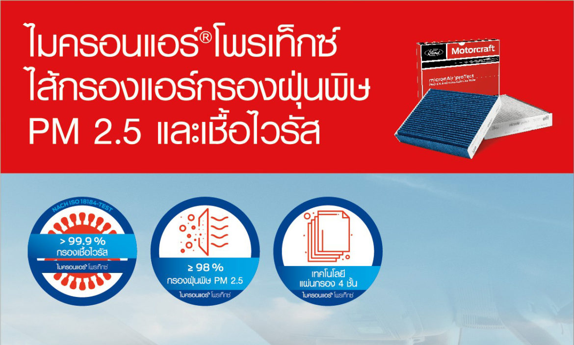 ฟอร์ด ประเทศไทย เปิดตัว ไมครอนแอร์® โพรเท็กซ์ ไส้กรองแอร์คุณภาพสูงรุ่นใหม่ภายใต้แบรนด์มอเตอร์คราฟท์ที่จะช่วยให้อากาศในห้องโดยสารสะอาดและบริสุทธิ์ด้วยคุณสมบัติในการกรองฝุ่น PM2.5 ปกป้องและยับยั้งการเติบของเชื้อไวรัสและแบคทีเรีย ลดสารก่อภูมิแพ้ ควัน และอนุภาคอื่นๆ รวมถึงดูดซับแก๊สหรือกลิ่นไม่พึงประสงค์จากภายนอกได้อย่างดีเยี่ยม ไส้กรองแอร์ ไมครอนแอร์® โพรเท็กซ์ พร้อมจำหน่ายและติดตั้งแล้ววันนี้สำหรับรถฟอร์ด เรนเจอร์ ตั้งแต่รุ่นปี 2011 และฟอร์ด เอเวอเรสต์ ตั้งแต่รุ่นปี 2015 ที่ศูนย์บริการฟอร์ดทั่วประเทศ