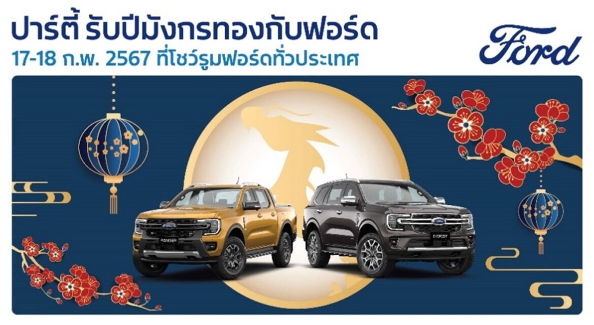 ฟอร์ด ประเทศไทย ร่วมกับผู้จำหน่ายฟอร์ด ต่อยอดโปรแรงจัด ‘ปาร์ตี้รับปีมังกรทองกับฟอร์ด’ ระหว่างวันที่ 17-18 กุมภาพันธ์ 2567 ที่โชว์รูมฟอร์ดทั่วประเทศ ชวนลูกค้าเลือกซื้อรถฟอร์ดกับข้อเสนอที่พลาดไม่ได้ #นาทีทองต้องจองฟอร์ด ซื้อรถฟอร์ดแจกทันทีทองคำแท่ง 1 บาท ทุกคัน เสริมมงคลตลอดทั้งปี พิเศษ! ลูกค้าเจ้าของรถทุกแบรนด์ที่นำรถมาแลกซื้อรถฟอร์ด เรนเจอร์ และฟอร์ด เรนเจอร์ แร็พเตอร์ รับส่วนลดเพิ่มอีก 30,000 บาททันที สำหรับลูกค้าที่จองและออกรถระหว่างวันที่ 1-29 กุมภาพันธ์ 2567