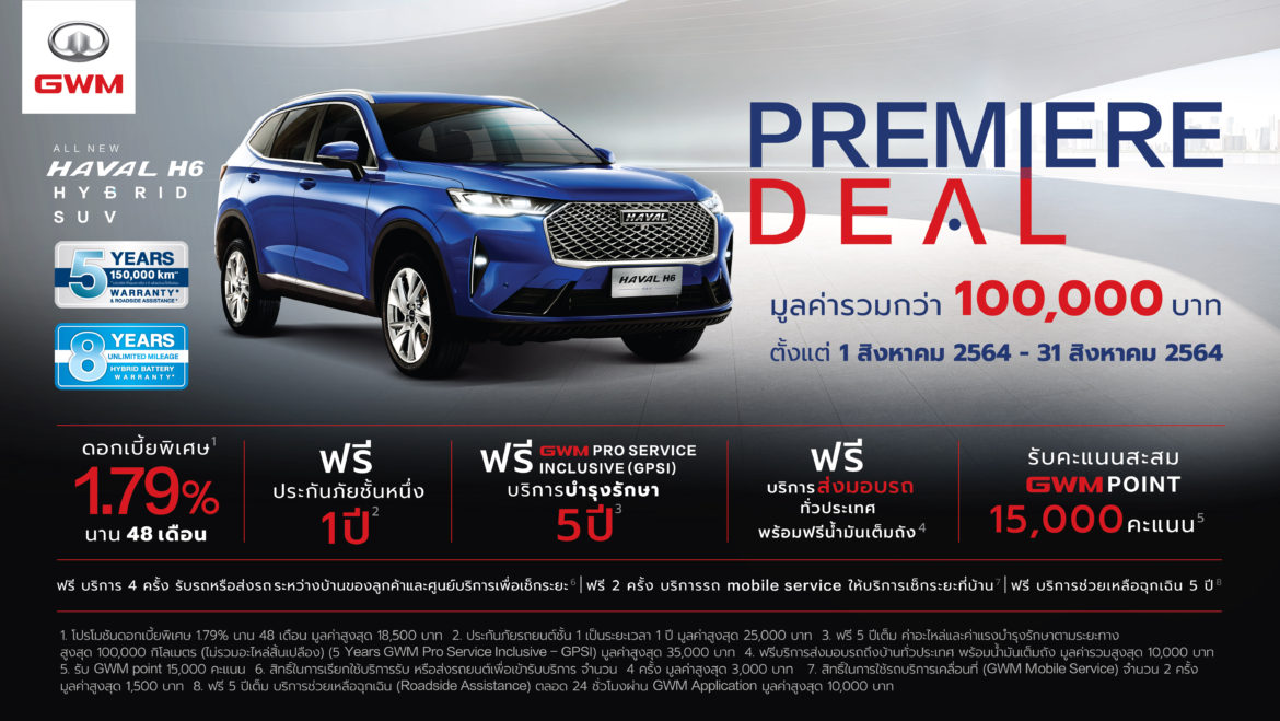 เกรท วอลล์ มอเตอร์ ขอบคุณการตอบรับอย่างอบอุ่นจากคนไทยที่มีต่อ All New HAVAL H6 Hybrid SUV พร้อมเดินเคียงข้างคนไทยในช่วงสถานการณ์ปัจจุบัน ด้วยการประกาศขยายระยะเวลาแคมเปญ PREMIERE DEAL ต่ออีก 1 เดือนเต็ม มอบความคุ้มค่ากับข้อเสนอสุดพิเศษให้แก่ลูกค้าตั้งแต่ 1 สิงหาคม 2564 – 31 สิงหาคม 2564 ยืนยันเดินหน้าส่งมอบรถยนต์อัจฉริยะที่เต็มเปี่ยมไปด้วยประสบการณ์ขับขี่เหนือระดับ และบริการหลังการขายแบบครบวงจร