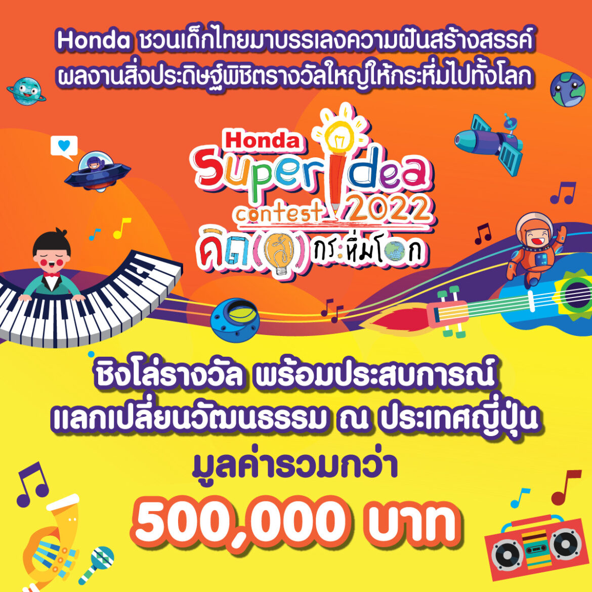 หากนึกถึงโครงการหรือกิจกรรมส่งเสริมความคิดสร้างสรรค์และจินตนาการของเยาวชน และเป็นพื้นที่แห่งแรงบันดาลใจให้เยาวชนมุ่งมั่นที่จะก้าวตามความฝันของตนเองต้องมีชื่อของโครงการ “ฮอนด้า ซูเปอร์ ไอเดีย คอนเทสต์” อย่างแน่นอน ซึ่งตลอด 17 ปีของการดำเนินการโดย บริษัท ฮอนด้า ออโตโมบิล (ประเทศไทย) จำกัด ได้เปิดรับไอเดียจากความฝันและจินตนาการจากการออกแบบสิ่งประดิษฐ์แห่งอนาคตที่สนุก สร้างสรรค์ และมีประโยชน์ต่อสังคมของเยาวชนระดับชั้นประถมศึกษาปีที่ 1-6 ทั่วประเทศ กว่า 430,000 คน ในปีนี้ บริษัทฯ ได้สานต่อโครงการฯ เป็นปีที่18 ภายใต้แนวคิด “บรรเลงความคิด สร้างท่วงทำนองความฝัน ขับขานจินตนาการเด็กไทย ให้กังวานไกลไปทั่วโลก” โดยเปิดรับสมัครไอเดียจากน้อง ๆ ทั่วประเทศ ตั้งแต่วันที่ 30 กรกฎาคม – 30 กันยายน 2565 สามารถติดตามรายละเอียดเพิ่มเติมได้ที่ https://www.facebook.com/hondasuperidea