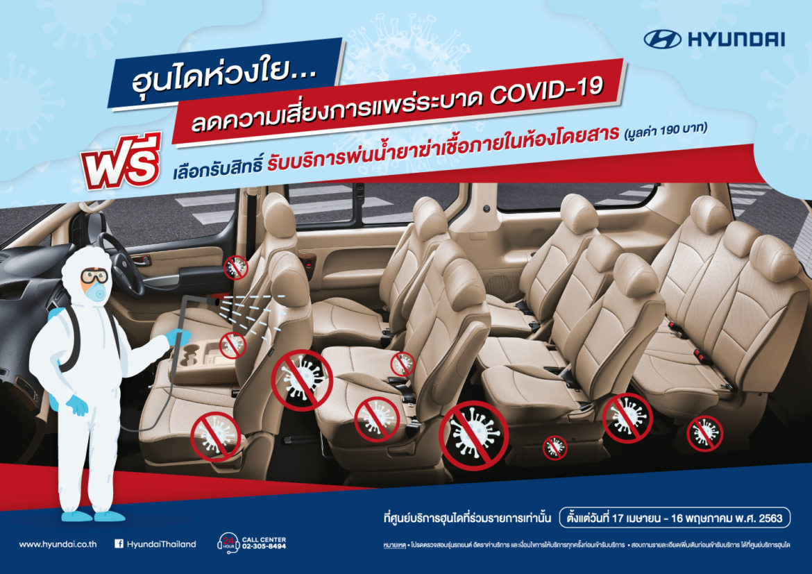 บริษัท ฮุนได มอเตอร์ (ไทยแลนด์) จำกัด เชิญชวนลูกค้าฮุนไดทุกรุ่นร่วมแคมเปญ “ฮุนไดห่วงใยลดความเสี่ยงการแพร่ระบาด Covid-19” บริการพ่นยาฆ่าเชื้อโรคภายในห้องโดยสาร ฟรี