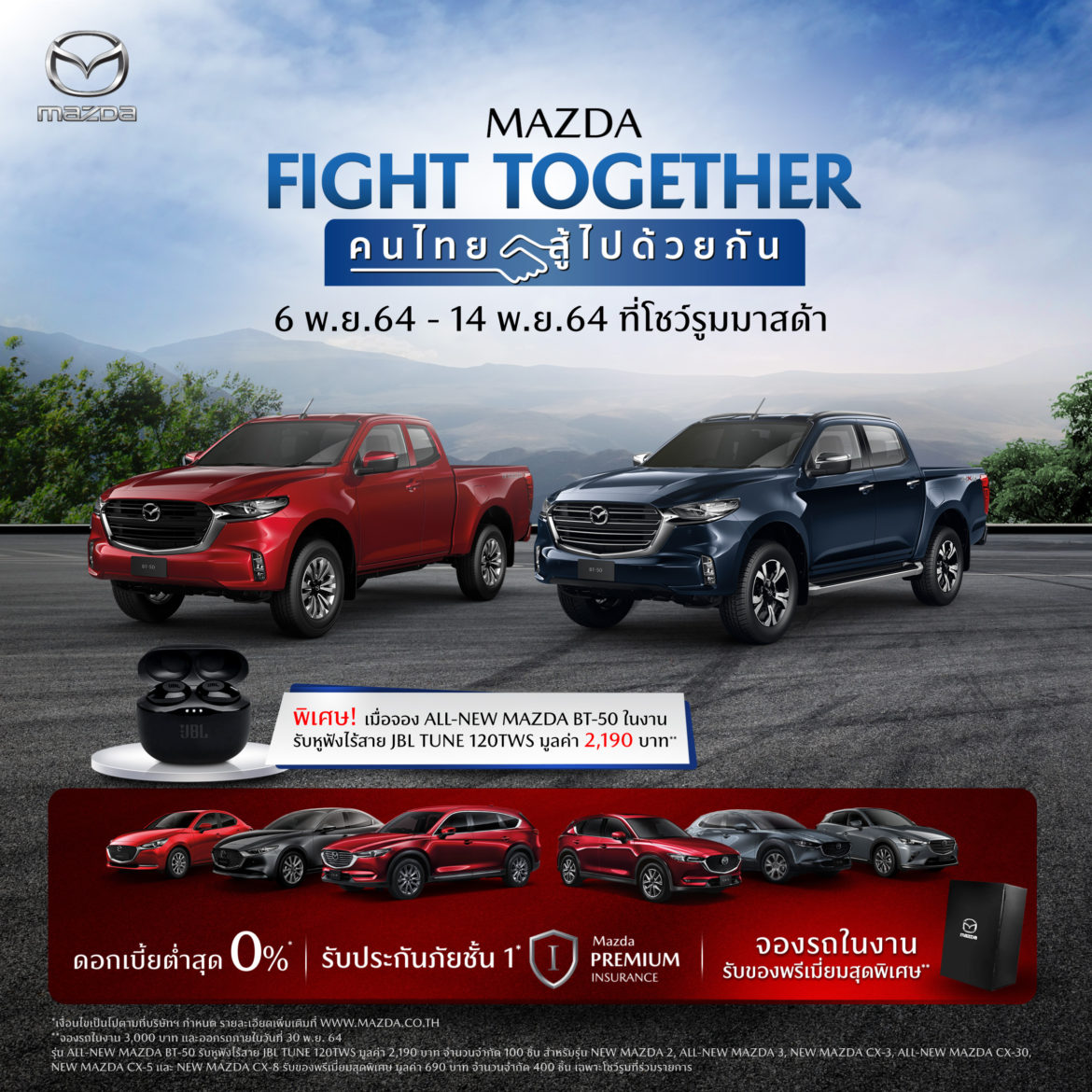 มาสด้าส่งแคมเปญ MAZDA FIGHT TOGETHER คนไทยสู้ไปด้วยกัน ดอกเบี้ยต่ำสุด 0% ฟรีประกันภัยชั้น 1