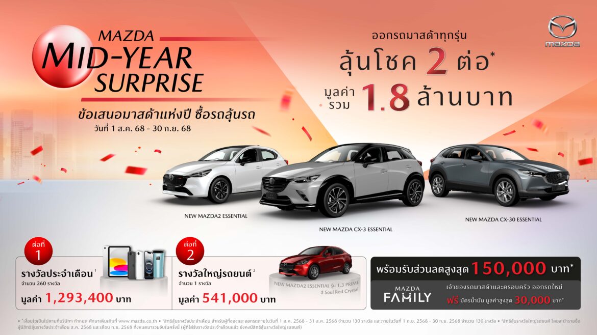 มาสด้าจัดให้รับข้อเสนอใหญ่สุดแห่งปี “MAZDA MID-YEAR SURPRISE” ซื้อรถลุ้นรถ ออกรถมาสด้าทุกรุ่นลุ้นโชค 2 ต่อ มูลค่า 1.8 ล้านบาท