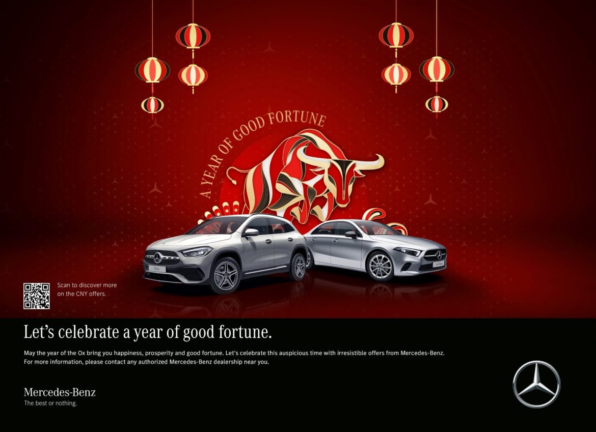 เมอร์เซเดส-เบนซ์ ส่งโปรแรง A Year of Good Fortune ฉลองตรุษจีนรับปีวัวแบบเฮง ๆ กับข้อเสนอสุดเร้าใจของรถยนต์เมอร์เซเดส-เบนซ์ ทั้งในกลุ่ม Compact car, Contemporary Luxury, Dream Cars รวมถึงแบรนด์รถสปอร์ตสมรรถนะสูงอย่าง “เมอร์เซเดส-เอเอ็มจี” ที่จัดมาให้ทั้งดอกเบี้ย 0% หรือผ่อนเริ่มต้นเพียง 1% และข้อเสนอสุดพิเศษอีกมากมาย ไม่ว่าจะเป็น