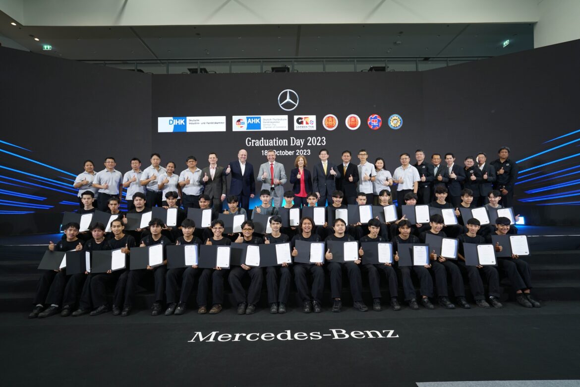 บริษัท เมอร์เซเดส-เบนซ์ (ประเทศไทย) จำกัด จัดพิธีมอบประกาศนียบัตรโครงการนักเรียนช่างฝึกหัดที่ผ่านการรับรองคุณภาพจากเมอร์เซเดส-เบนซ์ ตามมาตรฐานการศึกษาทวิภาคีเยอรมัน ในสาขาวิชาเมคคาทรอนิคส์ยานยนต์ เพื่อความเป็นเลิศในการศึกษาทวิภาคีและเพื่อพัฒนาศักยภาพ ของนักเรียนอาชีวะสู่การเป็นช่างเทคนิคมืออาชีพที่ผ่านการรับรองคุณภาพมาตรฐานเดียวกับประเทศเยอรมนี โดยมีประธานในพิธีคือ ” มร. มาร์ทิน ชเวงค์ ” ประธานเจ้าหน้าที่บริหารและกรรมการผู้จัดการใหญ่ บริษัท เมอร์เซเดส-เบนซ์ (ประเทศไทย) จำกัด พร้อมด้วย ” คุณเรจินา คิมเพล ” เลขานุการโท ฝ่ายเศรษฐกิจและพาณิชย์ สถานเอกอัครราชทูตเยอรมนีประจำประเทศไทย และ ” ดร. โรลันด์ ไวน์ ” ผู้อำนวยการบริหาร หอการค้าเยอรมัน-ไทย ร่วมกับตัวแทนสถาบันการศึกษาที่เข้าร่วมโครงการกับบริษัท เมอร์เซเดส-เบนซ์ (ประเทศไทย) จำกัด