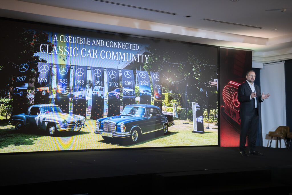 นอกจากนี้ สำหรับกลุ่มลูกค้าเมอร์เซเดส-เบนซ์ ที่เป็นนักสะสมและชื่นชอบรถยนต์คลาสสิกของ เมอร์เซเดส-เบนซ์ เรามีแผนที่จะสร้างพื้นที่ศูนย์กลางที่จะให้ผู้คนมารวมตัวกัน และตอกย้ำให้เห็นถึงคุณค่าที่เหนือกาลเวลาและประวัติศาสตร์ของรถยนต์รุ่นต่างๆ ผ่านการเปิดตัว Mercedes-Benz Classic Car Center แห่งแรกในทวีปเอเชีย ซึ่งจะมาเป็นแพลตฟอร์มที่จะให้ผู้เชี่ยวชาญด้านรถยนต์คลาสสิกของเมอร์เซเดส-เบนซ์ มาช่วยตรวจสอบรถยนต์คลาสสิกทุกรุ่น และออกใบรับรองอย่างเป็นทางการให้กับรถยนต์ที่ผ่านมาตรฐานรถยนต์คลาสสิกระดับโลกของเมอร์เซเดส-เบนซ์”