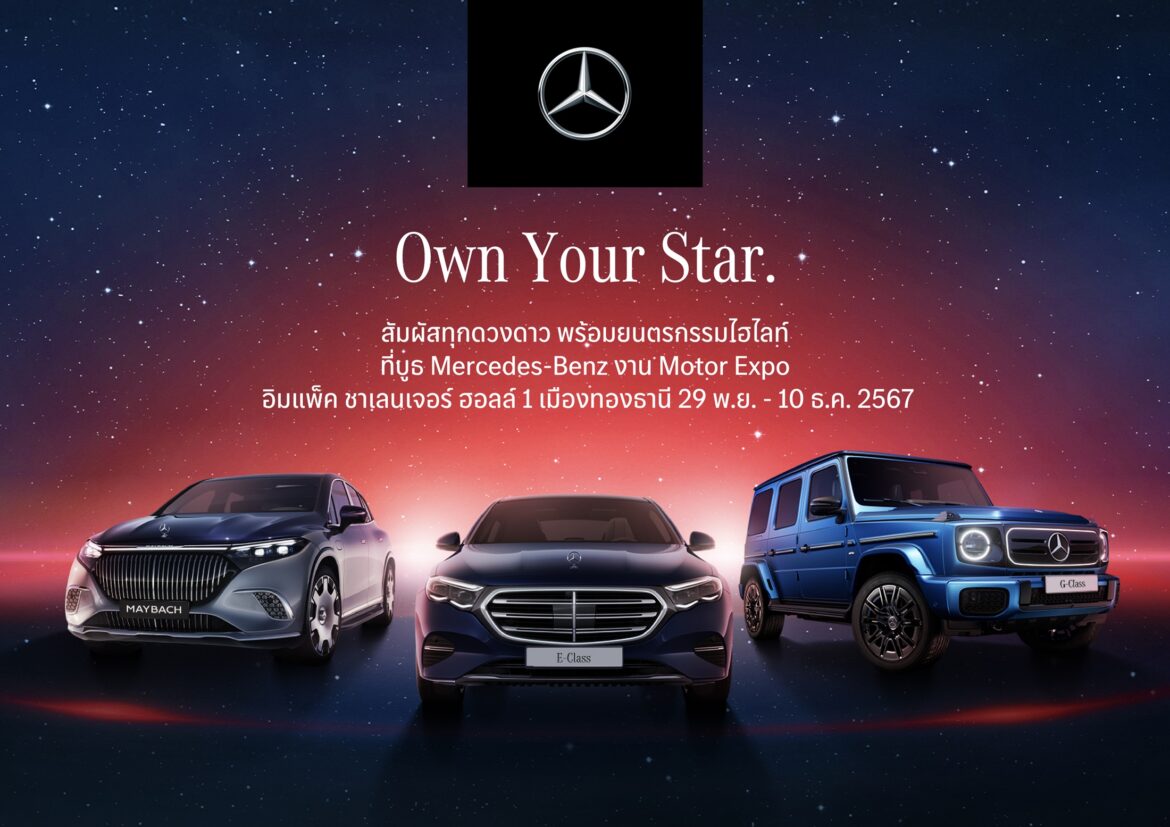 เบื้องหลังแนวคิดแคมเปญ “Own Your Star” มาจากสัญลักษณ์ดาวสามแฉกของเมอร์เซเดส-เบนซ์ ซึ่งเปรียบยนตรกรรมแต่ละรุ่นเสมือนดวงดาวแต่ละดวงที่รอให้คุณมาครอบครอง โดยมีดาวดวงใหม่ที่กำลังจะเฉิดฉายในงาน Motor Expo ที่จะถึงนี้ อย่างยนตรกรรมที่เปิดตัวล่าสุด ได้แก่ G-Class ทั้งรุ่นเครื่องยนต์ดีเซลและรุ่นพลังงานไฟฟ้า EQ Technology, Mercedes-Maybach EQS SUV, E-Class รุ่น Exclusive Line และ V-Class รวมถึงดวงดาวอีกหลายเซกเมนต์ที่เตรียมให้คุณไปสัมผัสและเป็นเจ้าของในงาน