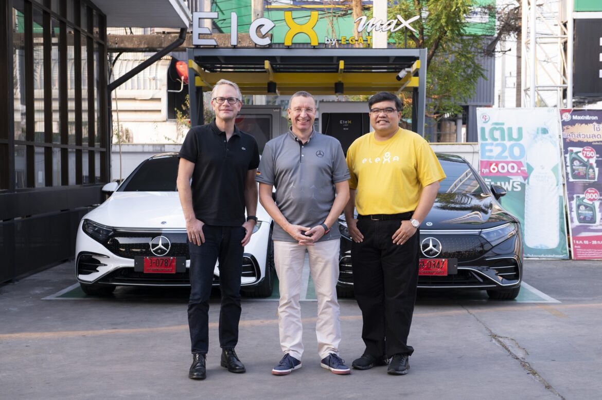 ” มร. มาร์ทิน ชเวงค์ ” ประธานบริหาร บริษัท เมอร์เซเดส-เบนซ์ (ประเทศไทย) จำกัด และ ” มร. บีเยิร์น กุซเทรา ” รองประธานบริหารฝ่ายขายและการตลาด บริษัท เมอร์เซเดส-เบนซ์ (ประเทศไทย) จำกัด พร้อมกับ ” นายวฤต รัตนชื่น ” ผู้ช่วยผู้ว่าการวิจัย นวัตกรรม และพัฒนาธุรกิจ ทำหน้าที่ Project Management Office การไฟฟ้าฝ่ายผลิตแห่งประเทศไทย (กฟผ.) ถ่ายภาพร่วมกันระหว่างทริปการทดสอบการขับขี่รถยนต์ไฟฟ้า 100% รุ่น EQS 500 4MATIC AMG Premium พร้อมเดินหน้าขับเคลื่อนประเทศสู่สังคมคาร์บอนต่ำอย่างยั่งยืน ณ สถานี EleX by EGAT เชียงใหม่ 8 ผ่านความร่วมมือของเมอร์เซเดส-เบนซ์ และ กฟผ. ในการส่งเสริมการใช้พลังงานสะอาด (Clean Energy) และสร้างความรู้ความเข้าใจให้คนไทยหันมาใช้รถยนต์พลังงานไฟฟ้า 100% ให้มากขึ้น เพื่อลดการปล่อยมลพิษออกสู่อากาศ มุ่งสู่เป้าหมายความเป็นกลางทางคาร์บอน (Carbon Neutrality) ร่วมกันในประเทศไทย ภายในปี ค.ศ. 2050