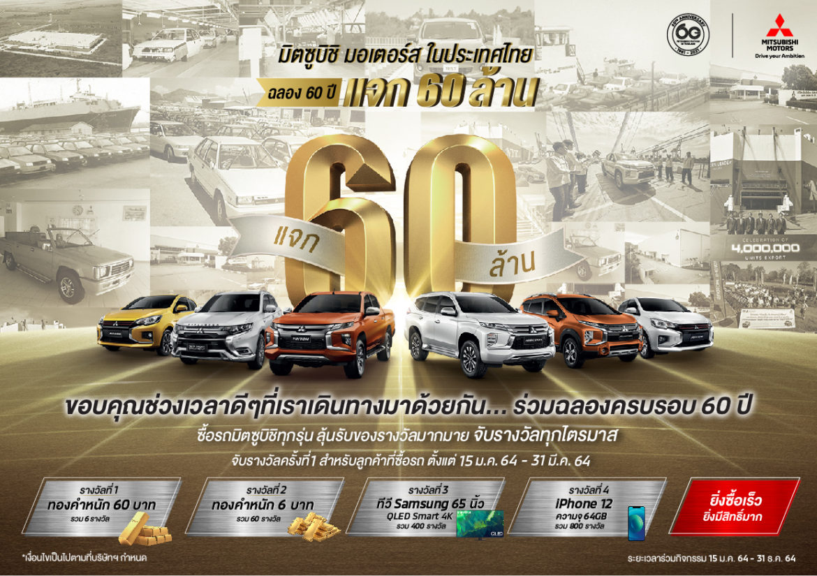 พร้อมขอบคุณคนไทยด้วยแคมเปญพิเศษ มอบเป็นของขวัญสุดเซอร์ไพรส์ในโอกาสสำคัญกับแคมเปญ “มิตซูบิชิ มอเตอร์ส ในประเทศไทย ฉลอง 60 ปี แจก 60 ล้าน” แจกทองคำแท่ง 60 บาท จำนวน 6 รางวัล และรางวัลอื่นๆ รวมกว่า 1,200 รางวัล รวมมูลค่ากว่า 60 ล้านบาท สำหรับผู้ที่ซื้อรถยนต์มิตซูบิชิ รุ่นใดก็ได้ เริ่มแล้ววันนี้ – 31 ธันวาคม 2564 ยิ่งซื้อเร็ว ยิ่งมีสิทธิ์มาก