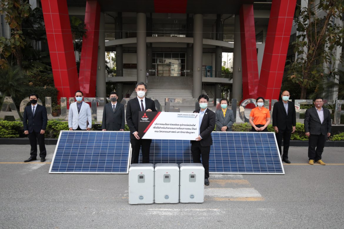 บริษัท มิตซูบิชิ มอเตอร์ส (ประเทศไทย) จำกัด นำโดย นายชลัช กังวานธนวัต (ที่ 4 จากซ้าย) ผู้อำนวยการใหญ่ สำนักวิศวกรรมการผลิต เป็นตัวแทนบริษัทฯ มอบแผงโซลาร์เซลล์พร้อมด้วยอุปกรณ์แปลงไฟ ให้แก่คณะวิศวกรรมศาสตร์ มหาวิทยาลัยบูรพา เพื่อใช้เป็นสื่อการเรียนการสอน โดยมี ผศ.ดร.ณยศ คุรุกิจโกศล (ที่ 5 จากขวา) คณบดีคณะวิศวกรรมศาสตร์ ดร.ไพบูลย์ ลิ้มปิติพานิชย์ (ที่ 4 จากขวา) หัวหน้าภาควิชาวิศวกรรมเครื่องกล และ ดร.ณัฐพันธ์ ถนอมสัตย์ (ที่ 1 จากขวา) หัวหน้าภาควิชาวิศวกรรมไฟฟ้า เป็นผู้รับมอบ ณ คณะวิศวกรรมศาสตร์ มหาวิทยาลัยบูรพา ซึ่งการสนับสนุนในครั้งนี้เป็นส่วนหนึ่งของโครงการเพื่อสังคมของมิตซูบิชิ มอเตอร์ส ประเทศไทย ภายใต้ปณิธานด้านความรับผิดชอบต่อสังคม “สรรค์สร้าง เคียงข้าง สังคมไทย”
