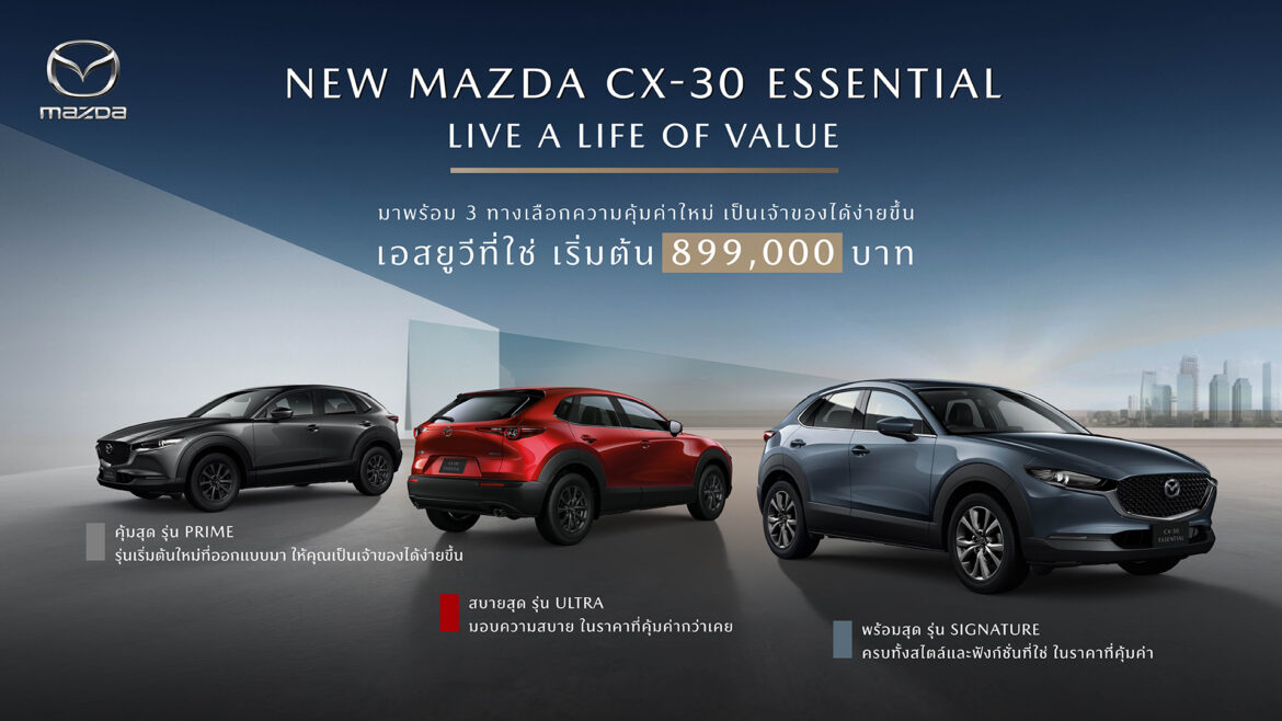 มาสด้าเผยโฉมอีกหนึ่งยนตรกรรมภายใต้ ESSENTIAL COLLECTION ครอสโอเวอร์เอสยูวีสปอร์ตพรีเมี่ยม NEW MAZDA CX-30 ESSENTIAL ภายใต้แนวคิด “LIVE A LIFE OF VALUE” เติมเต็มชีวิตให้คุ้มค่ากับเอสยูวีที่ใช่ ตอบโจทย์ทุกความต้องการ สง่างามด้วย โคโดะ ดีไซน์ ที่ออกแบบภายใต้คอนเซ็ปต์ “Less is More” เรียบง่ายแต่งดงาม คงไว้ซึ่งความโฉบเฉี่ยวและทรงพลัง มาพร้อมระบบควบคุมสมรรถนะการขับขี่อัจฉริยะขั้นสูง GVC Plus เหนือระดับด้วยเครื่องยนต์สกายแอคทีฟเบนซิน 2.0 ลิตร ทั้งแรงและประหยัดน้ำมัน ตอบสนองดีที่สุดให้กำลังสูงสุด 165 แรงม้า สัมผัสประสบการณ์ใหม่แห่งการควบคุมการขับขี่ที่แม่นยำและสมดุล ด้วยสกายแอคทีฟแพลตฟอร์มเจเนอเรชั่นใหม่ อัดแน่นด้วยเทคโนโลยีความปลอดภัยรอบคัน ราคาจำหน่ายเริ่มต้นเพียง 899,000 บาท ดอกเบี้ย 2.49%1 ฟรีประกันภัยชั้นหนึ่ง Mazda Premium Insurance 1 ปี2 พิเศษสุด ลูกค้า Mazda Family รับฟรีบัตรน้ำมันมูลค่า 20,000 บาท สนใจสอบถามข้อมูลเพิ่มเติมได้ที่โชว์รูมมาสด้าทั่วประเทศ หรือเว็บไซต์ www.mazda.co.th