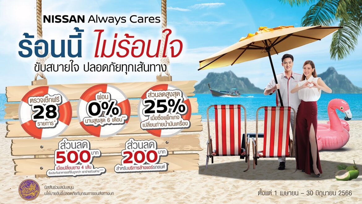 นิสสัน ประเทศไทย ส่งความห่วงใยต้อนรับเทศกาลสงกรานต์ มอบโปรโมชันพิเศษผ่านแคมเปญ “NISSAN ALWAYS CARES ร้อนนี้ ไม่ร้อนใจ ขับสบายใจ ปลอดภัยทุกเส้นทาง” ชวนลูกค้าเพิ่มความมั่นใจก่อนเดินทางไกลในช่วงเทศกาล ด้วยโปรโมชันตรวจเช็กสภาพรถยนต์ฟรี 28 รายการ พร้อมทั้งบริการล้างรถ ดูดฝุ่น ฉีดพ่นน้ำยาฆ่าเชื้อภายในรถยนต์ฟรี และส่วนลดพิเศษอื่น ๆ อีกมากมาย ตั้งแต่วันที่ 1 เมษายน – 30 มิถุนายน 2566