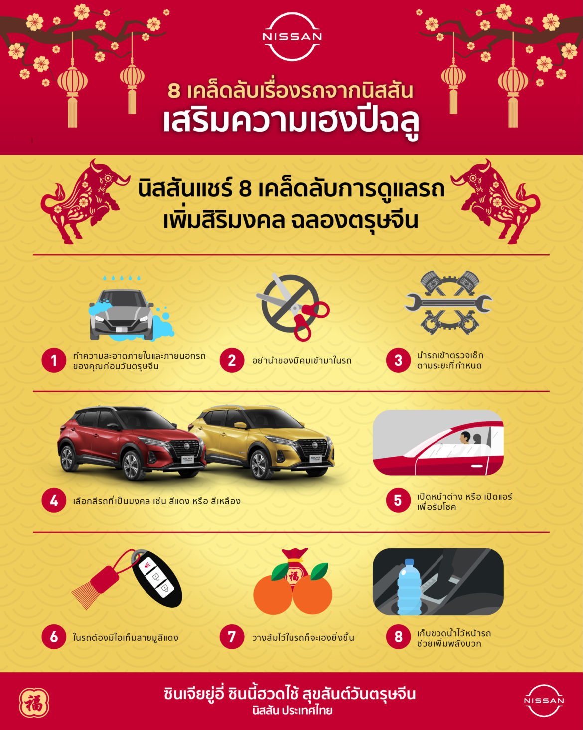 รถยนต์เป็นหนึ่งในทรัพย์สินชิ้นใหญ่ และสำคัญที่เราสามารถเป็นเจ้าของได้ ช่วงเทศกาล ตรุษจีน รถยนต์ก็สามารถช่วยดึงดูดโชคลาภ และความเจริญรุ่งเรืองได้เช่นกัน หลายคนตัดสินใจซื้อรถใหม่ในสีรถตามวันเกิด และปฏิบัติตามเคล็ดลับมงคลเพื่อเสริมดวง นิสสันขอนำเสนอแปดเคล็ดลับเรื่องรถต้อนรับปีวัว เพื่อให้โชคดีอยู่กับคุณ และรถคันโปรดตลอดปี 2564 นี้