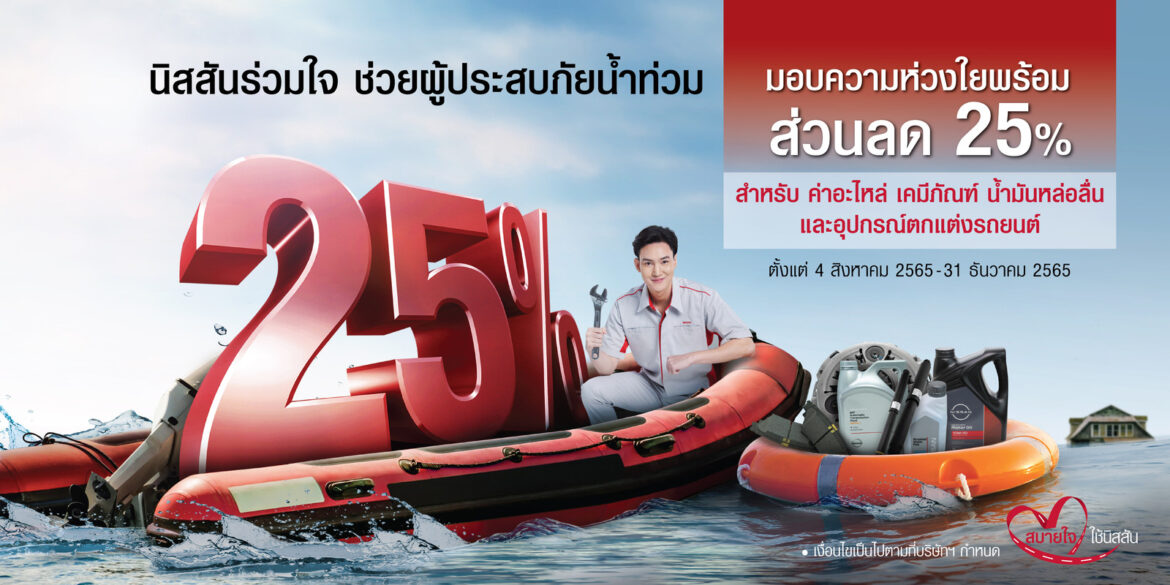 แคมเปญ “นิสสันร่วมใจช่วยผู้ประสบภัยน้ำท่วม” จะมอบส่วนลด 25% สำหรับค่าอะไหล่, เคมีภัณฑ์, น้ำมันหล่อลื่น และอุปกรณ์ตกแต่งรถยนต์ ในการดูแลซ่อมแซมรถยนต์นิสสันของลูกค้าที่ได้รับความเสียหายจากอุทกภัยที่กำลังเกิดขึ้นในหลายๆ พื้นที่ของประเทศ