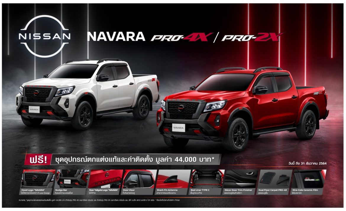 นิสสัน ประเทศไทย จัดโปรโมชั่นพิเศษส่งท้ายปีสำหรับ นิสสัน นาวารา ใหม่ รถกระบะกล้าเพื่อคนแกร่ง เสนอแคมเปญพิเศษ ออกรถ นาวารา PRO-4X สีแดงเบิร์นนิ่ง เรด และ PRO-2X สีแดง เบิร์นนิ่ง เรด, สีดำ แบล็ค สตาร์, และสีขาว ไวท์ เพิร์ล รับฟรี อุปกรณ์ตกแต่งแท้จากนิสสันพร้อมค่าติดตั้ง มูลค่า 44,000 บาท จำนวน 9 รายการ เสริมความดุดัน ยกระดับความหล่อที่เหนือใคร ประกอบด้วย