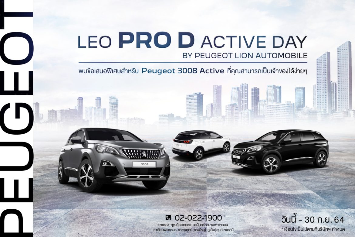 บริษัท เปอโยต์ ไลอ้อน ออโตโมบิล (ประเทศไทย) จำกัด ผู้แทนจำหน่ายรถยนต์ เปอโยต์ อย่างเป็นทางการในประเทศไทย เปิดโอกาสให้ลูกค้าได้จับจองรถยนต์ เปอโยต์ 3008 ACTIVE ที่มาพร้อมข้อเสนอสุดพิเศษ ภายในงาน ‘LEO PRO D ACTIVE DAY’ วันนี้ ถึงสิ้นเดือนกันยายน 2564 ที่โชว์รูม เปอโยต์ ไลอ้อน ออโตโมบิล ทุกสาขา