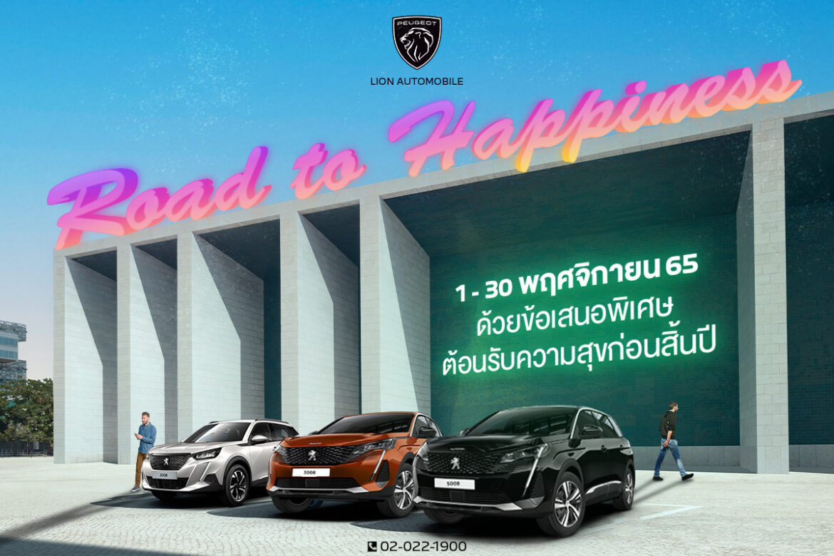 เปอโยต์ ไลอ้อน ออโตโมบิล ผู้แทนจำหน่ายรถยนต์ เปอโยต์ อย่างเป็นทางการในประเทศไทย ชวนครอบครองยนตรกรรมหรู เปอโยต์ เอสยูวีสัญชาติฝรั่งเศส กับแคมเปญต้อนรับความสุขก่อนสิ้นปี ภายใต้แนวคิด ‘ ROAD TO HAPPINESS ’ จองและออกรถในเดือนพฤศจิกายนวันนี้ รับข้อเสนอ สุดพิเศษแบบจัดเต็ม