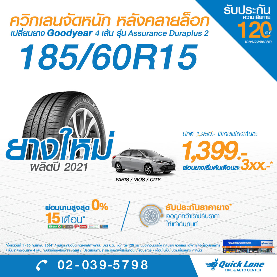 - เปลี่ยนยางกู๊ดเยียร์ 4 เส้น รุ่น Assurance Duraplus 2 ขนาด185/60R15 ราคาพิเศษเพียงเส้นละ 1,399 บาท (ปกติ 1,950 บาท พร้อมรับสิทธิพิเศษมากมาย ทั้งการรับประกันความพึงพอใจ 14 วัน รับประกันความเสียหายของยาง ทั้งบาด บวม แตก ตำ 120 วัน บริการช่วยเหลือรถเสียฉุกเฉินตลอด 24 ชั่วโมงเป็นเวลา 1 ปี รับประกันคุณภาพยาง 5 ปี พร้อมฟรีบริการครบครัน ทั้งบริการถอดใส่และถ่วงล้อ 4 ล้อ เติมลมไนโตรเจนฟรีตลอดอายุการใช้งาน และฟรีสลับยางและถ่วงล้อตลอด 2 ปี หรือ 50,000 กม.