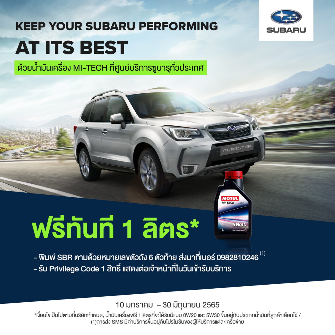 - สามารถแสดงรหัสสิทธิพิเศษ Privilege Code ต่อเจ้าหน้าที่เพื่อรับน้ำมันเครื่อง MI-Tech ฟรี 1 ลิตร เมื่อลูกค้าเข้ารับบริการเปลี่ยนถ่ายน้ำมันเครื่องที่ศูนย์บริการซูบารุทั่วประเทศ