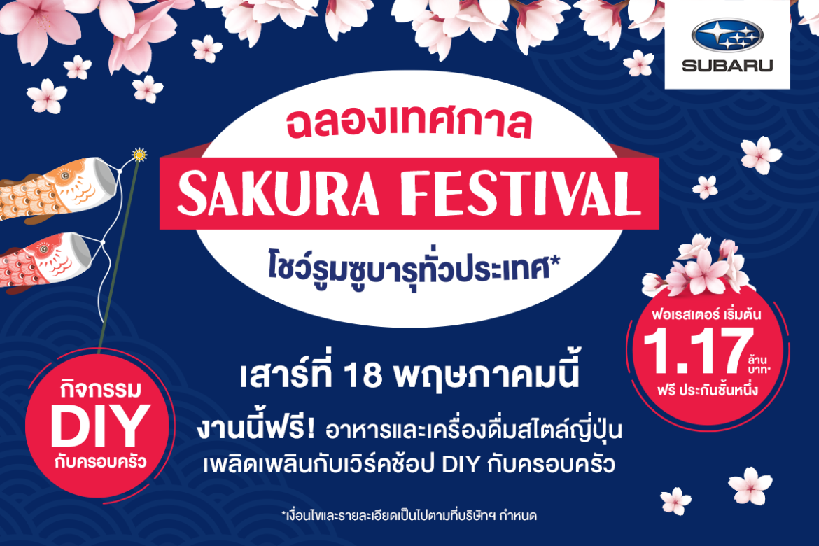 บริษัท ที ซี ซูบารุ (ประเทศไทย) จำกัด ผู้จัดจำหน่ายรถยนต์ซูบารุในประเทศไทยอย่างเป็นทางการ จัดแคมเปญใหญ่รับเทศกาลดอกซากุระบานที่ปีนี้ไม่ต้องไปไกลถึงประเทศญี่ปุ่น เพราะซูบารุเชิญชวนลูกค้าไปสัมผัสบรรยากาศ Cherry Blossom ที่โชว์รูมทั่วประเทศ วันเสาร์ที่ 18 พฤษภาคมนี้ ในงาน ฉลองเทศกาลดอกซากุระบาน SAKURA FESTIVAL บรรยากาศของความเป็นญี่ปุ่น สนุกกับกิจกรรม DIY ยอดนิยมของครอบครัวญี่ปุ่น พร้อมจัดโปร Special Price Special Deal  มอบส่วนลดและสิทธิพิเศษมากมายเมื่อจองในงาน ให้ลูกค้าเป็นเจ้าของรถคุณภาพในราคาเริ่มต้นเพียง 1.17 ล้านบาท สำหรับ Forester SUV ครอบครัวขนาดใหญ่ และ 0.99 ล้าน สำหรับ XV SUV ขนาดกลาง พร้อมฟรีประกันภัยทุกรุ่น วันนี้ – 31 พฤษภาคม 2567