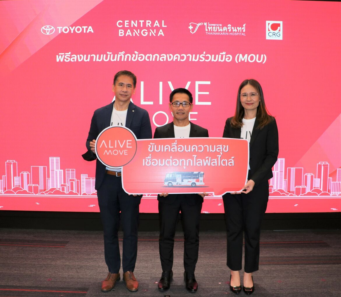 ” นายศุภกร รัตนวราหะ ” รองกรรมการผู้จัดการใหญ่ บริษัท โตโยต้า มอเตอร์ ประเทศไทย จำกัด ร่วมกับ ” นายฐิติ สิหนาถกถากุล ” ประธานบริหาร โรงพยาบาลไทยนครินทร์ และ ” นางสาวธนัชชพร พงษ์เย็น ” ผู้จัดการทั่วไป ศูนย์การค้า เซ็นทรัล บางนา ร่วมลงนามบันทึกข้อตกลงเปิดตัวบริการรูปแบบใหม่ “ALIVE MOVE” ผนึกกำลังร่วมมือกันเพื่อสร้างสรรค์สิ่งดีๆ แก่สังคมไทย แบ่งปันประสบการณ์การเดินทางผ่านการให้บริการขนส่งมวลชน เพื่อเป็นประโยชน์ต่อสังคมโดยรวม แก้ปัญหาการขนส่ง และอำนวยความสะดวกของคนในเมือง เชื่อมต่อทุกไลฟ์สไตล์แบบไร้รอยต่อ พร้อมสิทธิประโยชน์มากมายจากพันธมิตร ทั้ง เซ็นทรัล ผู้นำห้างสรรพสินค้าที่เป็นแหล่งไลฟ์สไตล์ ทั้งกิน เที่ยว ชอป และ โรงพยาบาลไทยนครินทร์ ผู้นำการให้บริการด้านสุขภาพ เมื่อวันที่ 24 กุมภาพันธ์ ณ TOYOTA ALIVE SPACE บางนา