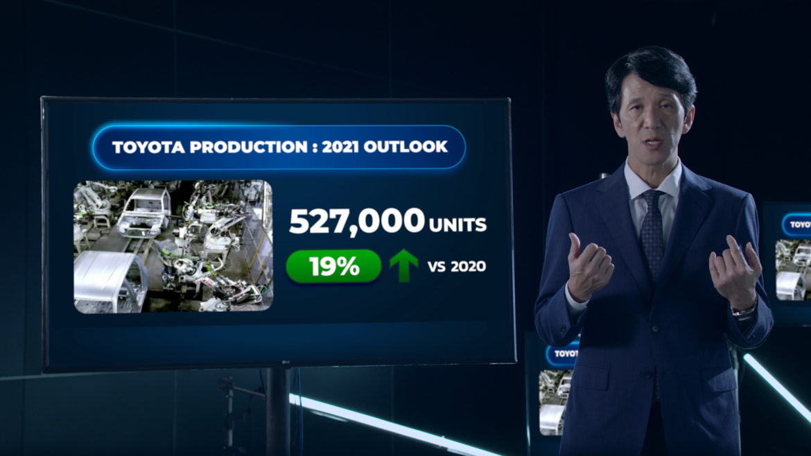 ทั้งนี้สำหรับเป้าหมายการส่งออกรถยนต์สำเร็จรูปของโตโยต้าในปีนี้ คาดการณ์ว่าปริมาณการส่งออกจะอยู่ที่ 254,000 คัน เพิ่มขึ้น 18% จากปีที่แล้ว เนื่องจากความต้องการที่เพิ่มมากขึ้นจากภูมิภาคหลัก เช่น เอเชียและโอเชียเนีย ทั้งนี้โตโยต้าตั้งเป้าการผลิตรถยนต์อยู่ที่ 527,000 คัน หรือเพิ่มขึ้น 19% จากปี 2563 ซึ่งการคาดการณ์ดังกล่าว สอดคล้องกับเป้าหมายยอดขายของทั้งในระดับประเทศและระดับโลก