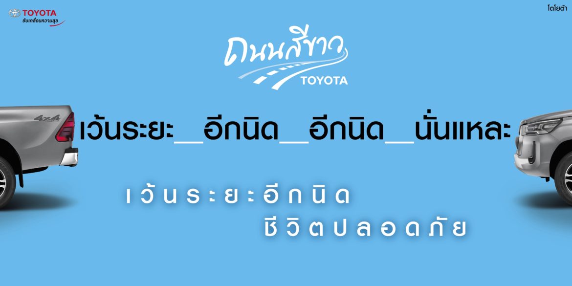 บริษัท โตโยต้า มอเตอร์ ประเทศไทย จำกัด เดินหน้ารณรงค์ขับขี่ปลอดภัยสไตล์ใหม่ ภายใต้โครงการโตโยต้าถนนสีขาว ส่งมอบความสุขในเทศกาลท่องเที่ยว ภายใต้แนวคิดการ “เว้นระยะห่างทั้งคน ทั้งรถ” ผ่านข้อความสื่อสาร “เว้นระยะอีกนิด ชีวิตปลอดภัย”