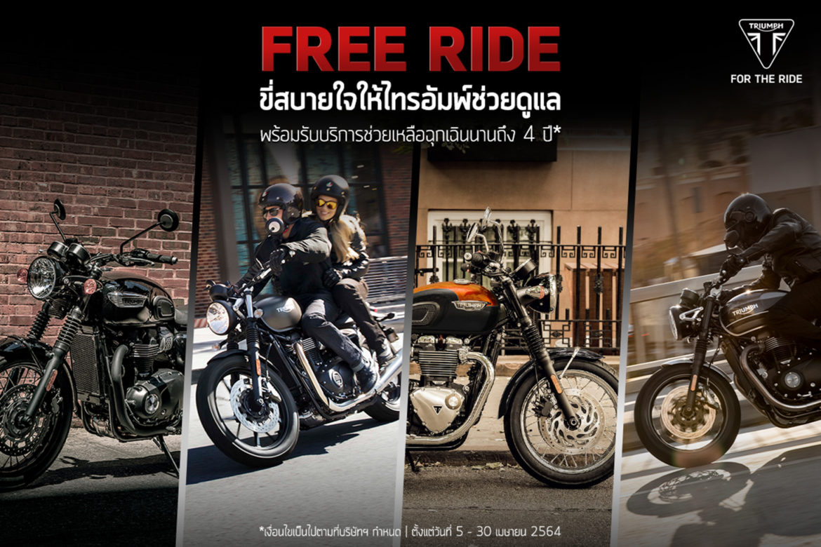 ไทรอัมพ์ มอเตอร์ไซเคิลส์ เอาใจคนรักรถตระกูลโมเดิร์นคลาสสิก เปิดโอกาสให้เป็นเจ้าของรถไทรอัมพ์ได้ง่ายยิ่งขึ้น ด้วยแคมเปญแรง “ฟรีไรด์” (Free Ride) จองวันนี้ไทรอัมพ์ช่วยผ่อนนานครึ่งปี! พร้อมรับบริการช่วยเหลือฉุกเฉิน (Triumph Roadside Assistance) นาน 4 ปี สำหรับผู้ที่จองรถรุ่นที่ร่วมรายการ ได้แก่