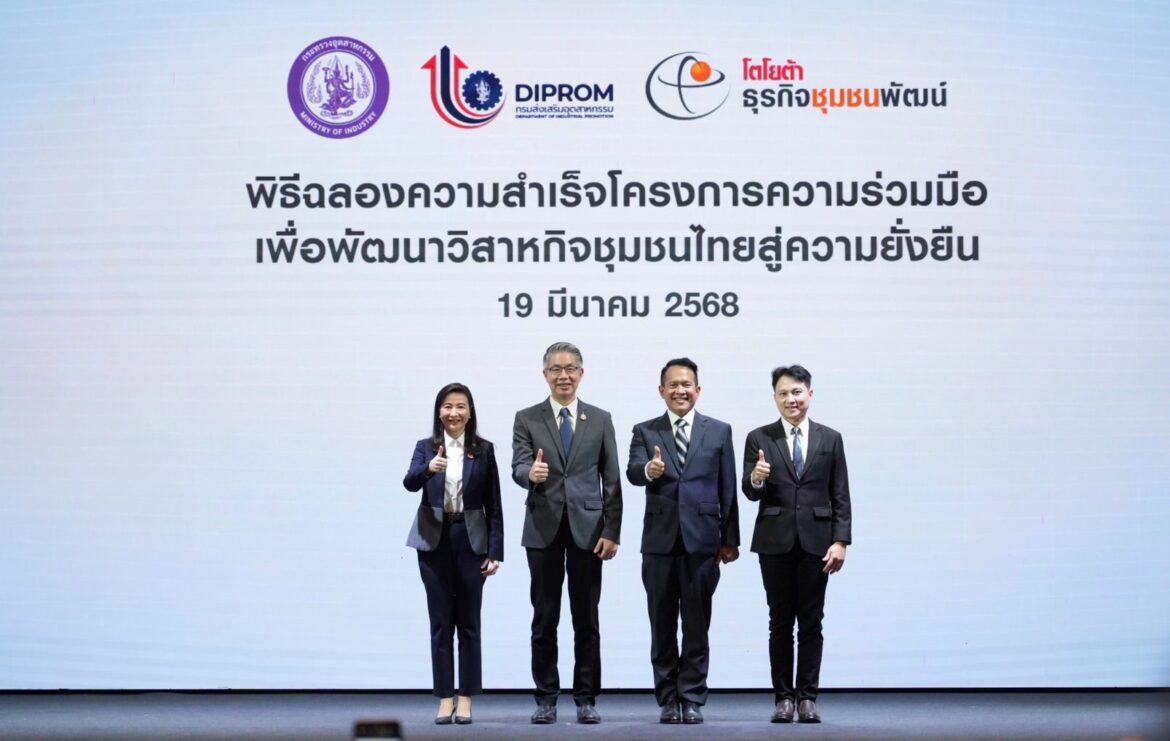 ดร.ณัฐพล รังสิตพล ปลัดกระทรวงอุตสาหกรรม นางสาวณัฏฐิญา เนตยสุภา อธิบดีกรมส่งเสริมอุตสาหกรรม นายสุรภูมิ อุดมวงศ์ รองกรรมการผู้จัดการใหญ่ บริษัท โตโยต้า มอเตอร์ ประเทศไทย จำกัด พร้อมด้วยคณะเจ้าหน้าที่จากกรมส่งเสริมอุตสาหกรรม และคณะผู้บริหารระดับสูง บริษัท โตโยต้า มอเตอร์ ประเทศไทย จำกัด ร่วมเป็นเกียรติภายในงานฉลองความสำเร็จ โครงการความร่วมมือเพื่อพัฒนาวิสาหกิจชุมชนไทยสู่ความยั่งยืน เมื่อวันพุธที่ 19 มีนาคม 2568 ที่ผ่านมา ณ Toyota ALIVE บางนา