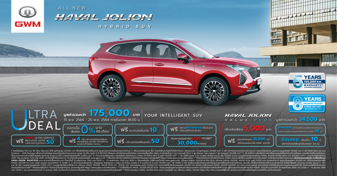 เกรท วอลล์ มอเตอร์ ส่งมอบแคมเปญสุดเอ็กซ์คลูซีฟสำหรับ All New HAVAL JOLION Hybrid SUV (ออล นิว ฮาวาล โจไลอ้อน ไฮบริด เอสยูวี) ก่อนการเปิดตัวอย่างเป็นทางการในประเทศไทยในวันที่ 25 พฤศจิกายนนี้ ด้วยแคมเปญ ULTRA DEAL ที่มาพร้อมข้อเสนอสุดพิเศษ อาทิ ผ่อน 0% นาน 48 เดือน เมื่อดาวน์ 25% ฟรีประกันรถยนต์ชั้น 1 เป็นระยะเวลา 1 ปี และบริการเหนือระดับอื่นๆ อีกมากมาย รวมมูลค่ากว่า 175,000 บาท เมื่อจองสิทธิ์ลงทะเบียนเพื่อซื้อรถยนต์รุ่นนี้ ในระหว่างวันที่ 15 พฤศจิกายน พ.ศ.2564 เวลา 00.01 น. ถึงวันที่ 25 พฤศจิกายน พ.ศ.2564 เวลา 18.00 น. นอกจากนี้ ลูกค้าที่ลงทะเบียนจองสิทธิ์เพื่อซื้อ All New HAVAL JOLION Hybrid SUV ในแคมเปญนี้ ยังสามารถเลือกซื้อแพ็กเกจเสริม HAVAL JOLION Value Plus สุดคุ้ม เพิ่มเติมได้อีกด้วย