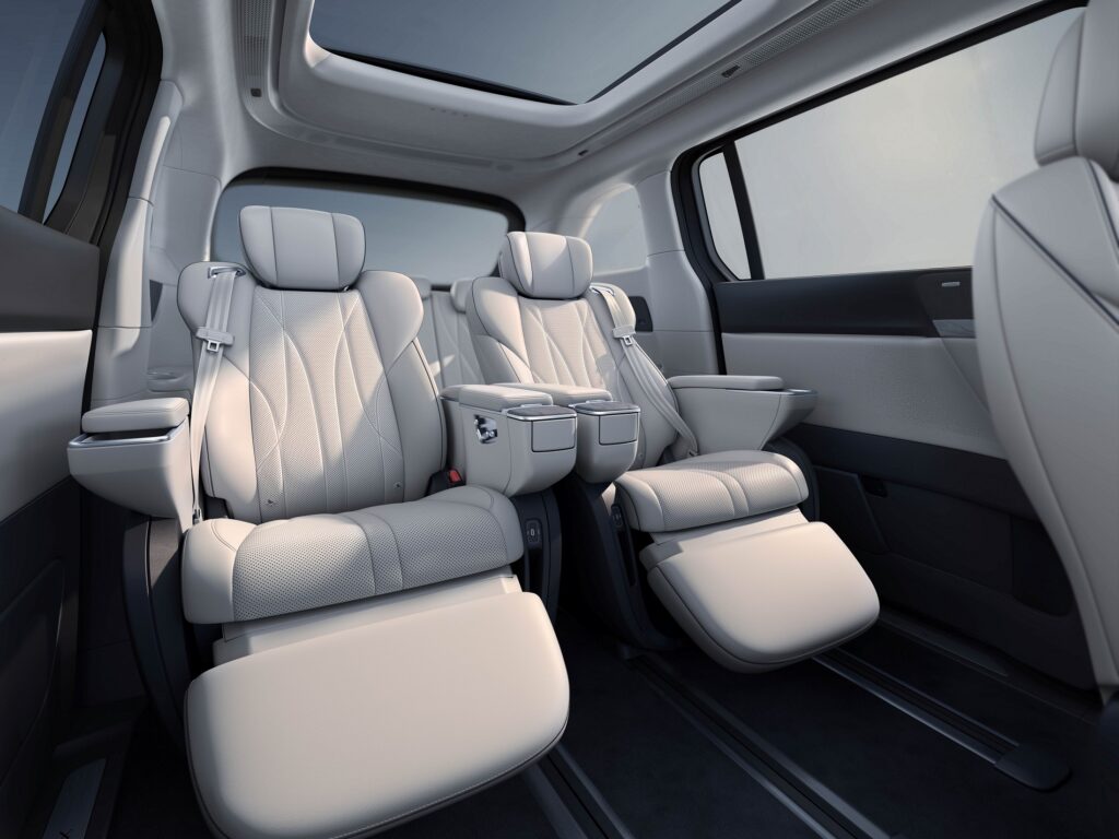 รถตู้ไฟฟ้าทรงสปอร์ตอัจฉริยะรุ่นท็อป ที่มาพร้อมความพิเศษยิ่งขึ้น โดดเด่นด้วยสีภายนอกMatte Gray ครั้งแรกในตลาด MPV ไฟฟ้า สอดรับกับเฉดสีภายในใหม่ Light Gray เบาะหนังแท้แนปป้า (Nappa) ผสานฟังก์ชั่น Zero-gravity Seat หรูหรามีระดับ เบาะนั่งแถวสองปรับไฟฟ้า 18 ทิศทาง พร้อมที่ชาร์จแบบไร้สาย 50 วัตต์ ล้ออัลลอยใหม่ดีไซน์แบบ Starlight Floating Wheels ขนาด 20 นิ้ว ผสานการขับเคลื่อนด้วยเทคโนโลยีแบตเตอรี่ 800 โวลต์ รองรับความเร็วในการชาร์จสูงสุดถึง 317 กิโลวัตต์ แบตเตอรี่ NCM ขนาด 101.5 กิโลวัตต์ ชาร์จไฟเต็มขับได้ไกลสุด 690 กิโลเมตร (NEDC) อีกทั้งยังมาพร้อมระบบเลี้ยว 4 ล้อ ให้รัศมีวงเลี้ยวเพียง 5.4 เมตร